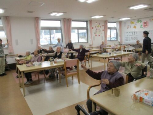 元気にラジオ体操を行い、
