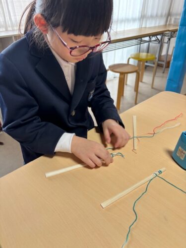 割りばしに糸を結ぶところに苦戦している児童もいましたが、