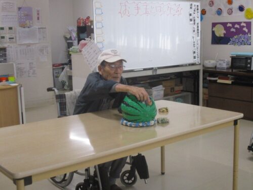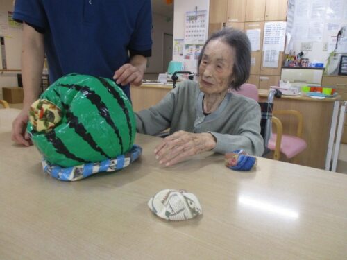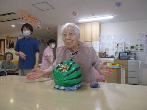 夏にちなんでスイカのビーチボールを使い、お手玉を遠くまで飛ばします🍉