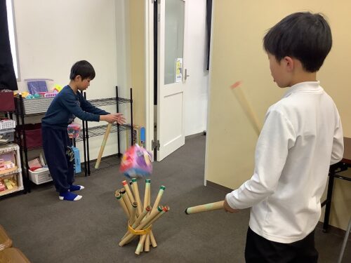 「あっちの棒の方が抜きやすいかも!」「あ!ちょっと動いた!」と、周りで見守るお友達も興味津々。 自分の番ではない時も、お友達を応援しながら自然とルールを守って楽しく参加することができました。