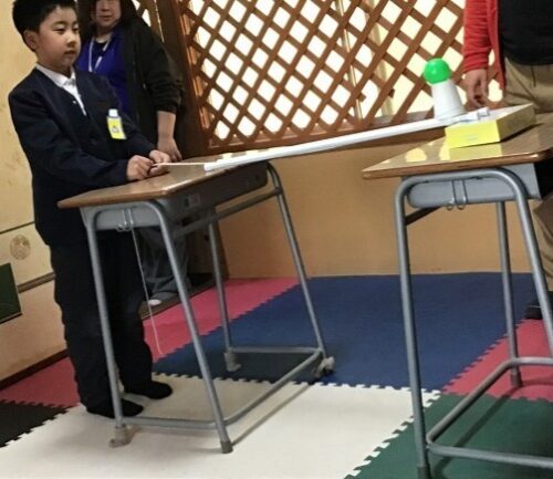 棒で作った長い橋の上に上下を逆にしたひも付きの紙コップを乗せ、