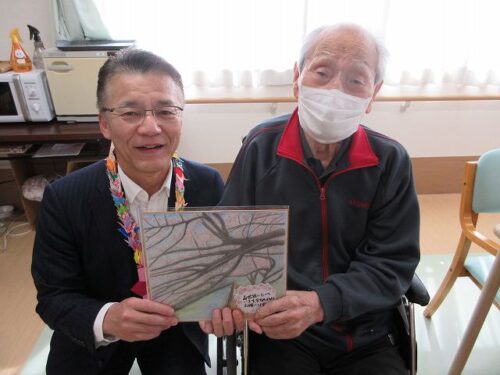 さわやかいなざわ館 山本社長来館されましたパート2♫ 【さわやかいなざわ館】 2026-03-12 2026-03-12 こんにちは、さわやかいなざわ館です🎵 前回に引き続き山本社長来館の様子お届けします 山本社長への贈り物としてご利用者様が絵を描いてくださいました(^^♪ 平和町の桜並木です🌸 皆様、ありがとうございました❕❕ 担当:屋嘉比🍀