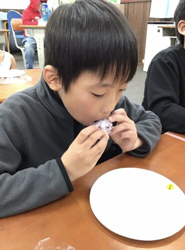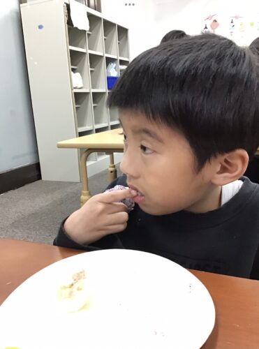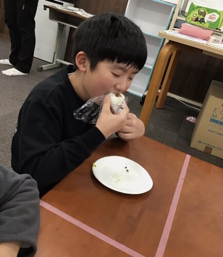 自分なりに握り方を工夫する姿や、お友達と見せ合いっこをする姿が見られ、にこにこで食べている姿が印象的でした!