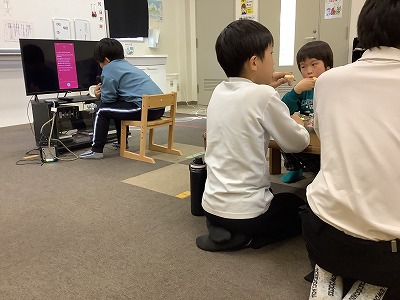 今回は**「おやつを食べながら楽しむ」**スタイル! お友達が歌っている間は、美味しいおやつを食べながら手拍子をしたり、リズムに乗ったり。 「歌う」だけでなく「聴く・応援する」というマナーも、楽しみながら自然と共有することができました。