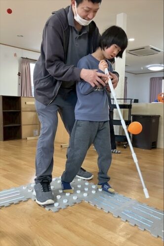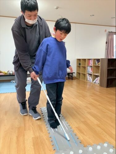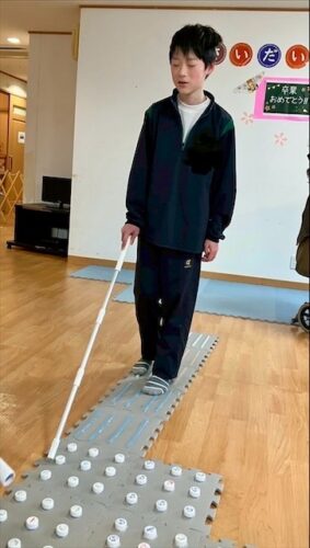 点字ブロックに模したマットの上を白杖に見立てた