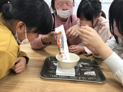 みんなで協力して測り、慎重に混ぜていました。