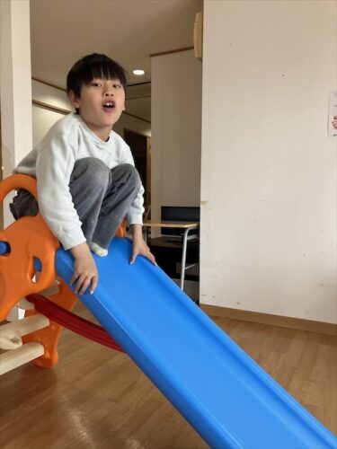滑り台を思い存分楽しむ児童。室内でもしっかり身体を動かして遊ふ事が出来ます。