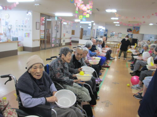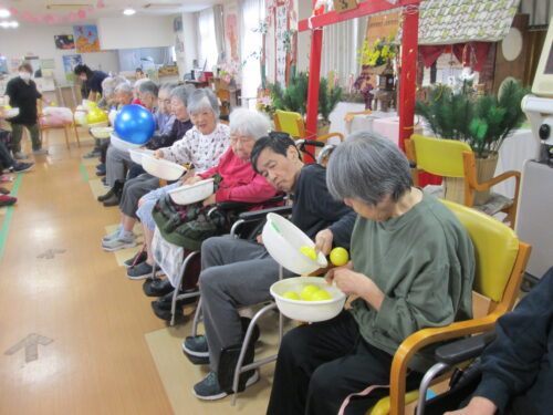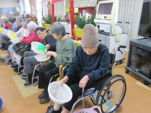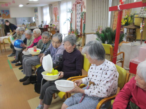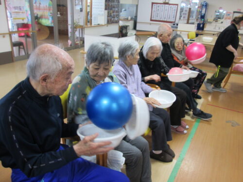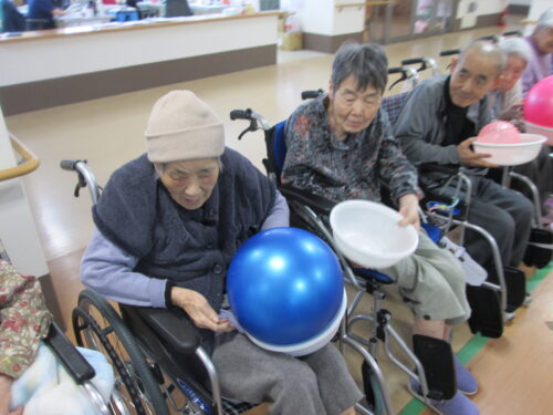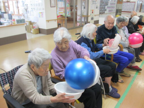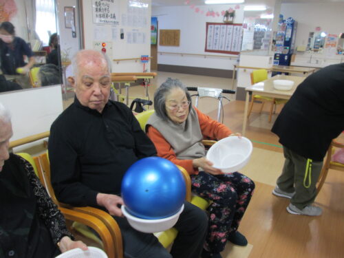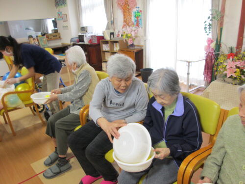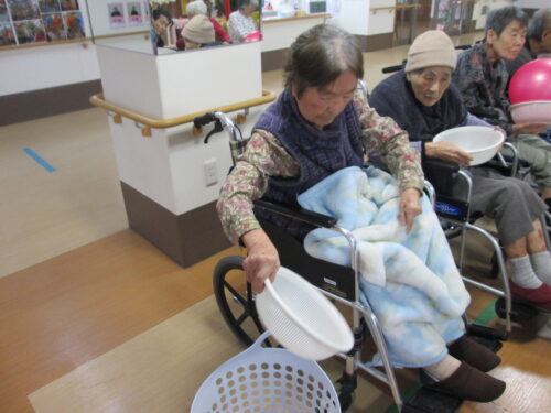 ザルに様々なボールを入れて隣の人に渡していきます。