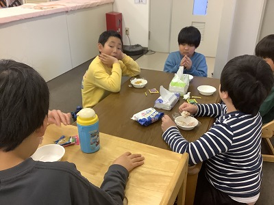 「これにもカルシウムが入ってるんだね!」とパッケージをじっくり読むお友達も。 ただ食べるだけでなく、**「体に良いものを摂っている」**という意識を自然に持てるような時間になりました。