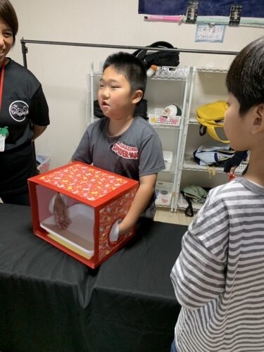 これは、箱の中に入っている野菜を触って、何の野菜か充てるゲームです。ズッキーニとそうめん瓜は難しかったね!