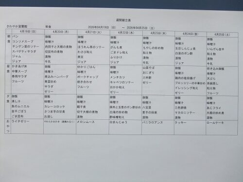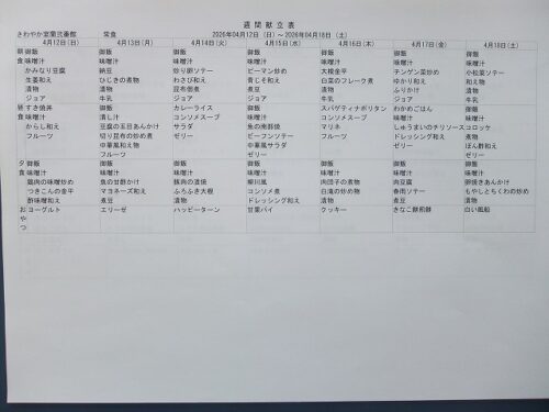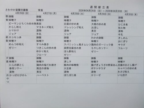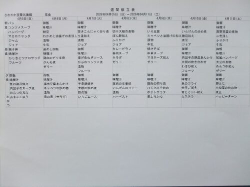 さわやか室蘭弐番館 4月 献立♪ 2026-04-01 2026-03-29 皆様こんにちは♪ 4月の献立をお届けします 行事食は25日(土)昼食です エレベーター内にも掲示しております 食材の都合により急遽 変更させて頂く場合もあります ご了承下さい