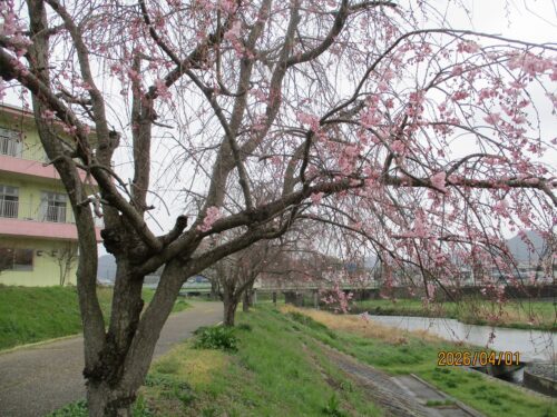 西に流れる川沿いの枝垂れ桜🌸もようやく咲き始めています🎵