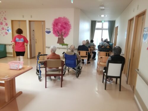 避難訓練開始のアナウンスが流れると職員の誘導のもとご入居様は落ち着いて行動され避難経路の確認を行うことができました。