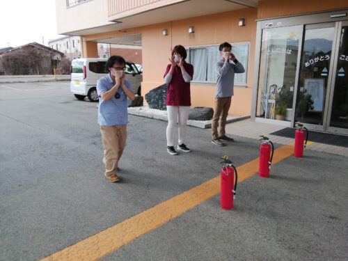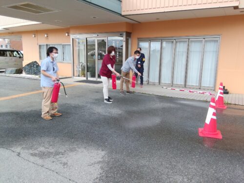 また、避難訓練の一環として職員を中心に消火器の使用方法についても指導も行いました。