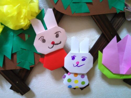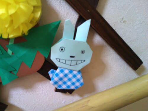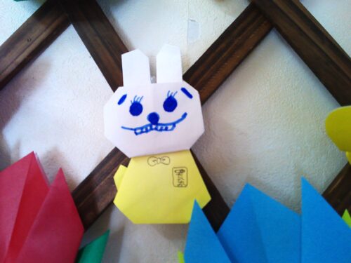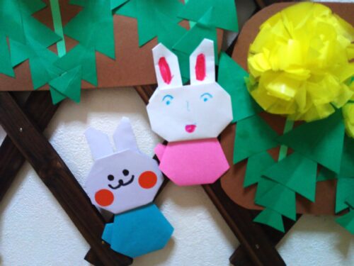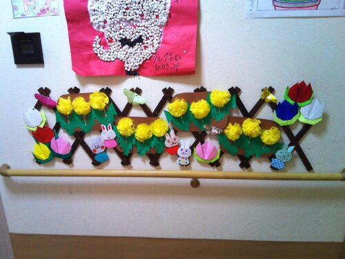 2階の廊下です。うさぎとチューリップを掲示しています。