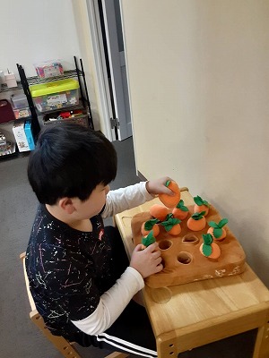 指先の巧緻性: にんじんを抜き差しする動作で手指のコントロールを養う。