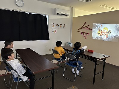 本日も元気いっぱいの活動の様子をお届けします。 今日は、みんなが楽しみにしていた**「さわやか映画館」と、集中力が試される「にんじんゲーム」**を行いました。