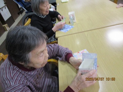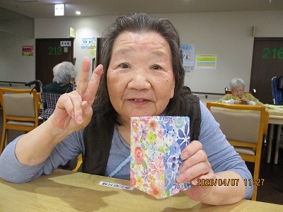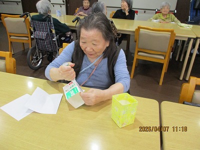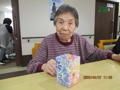 さわやかそう花の里 牛乳パックを使って 2026-04-09 2026-04-09 こんにちは 今週のレクリエーションは牛乳パックを使用🥛🐄 ペタペタ貼るだけであら簡単(^^♪ 花柄の綺麗な小物入れの完成です✨ 担当:白鳥