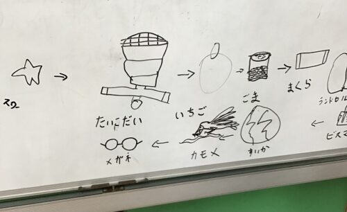 ホワイトボードには、かわいらしい「りす」から始まり、「スター」「太鼓台」…と、絵がどんどん繋がっていきます😉