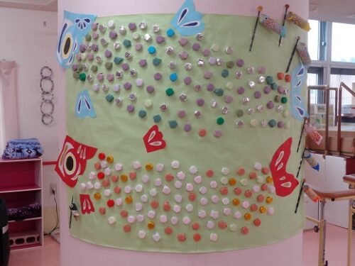 たくさんのペットボトルのふたに色紙を張り付けて、