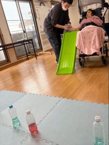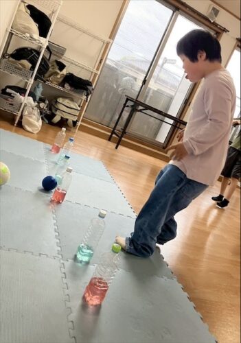 先日、障害物ボーリングをして児童も汗をかくくらい