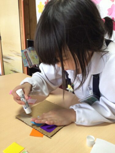 まず、ダンボールの土台に好きな色の折り紙を貼り、