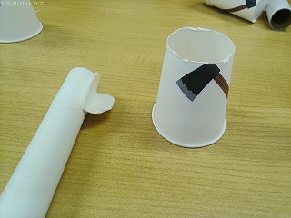 紙コップにタケノコのイラストを貼って