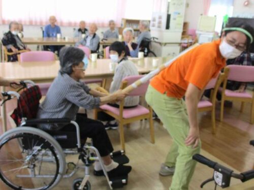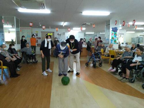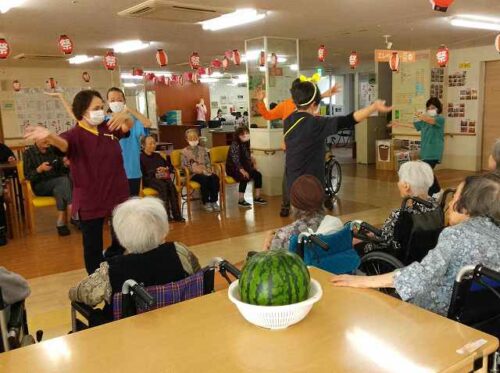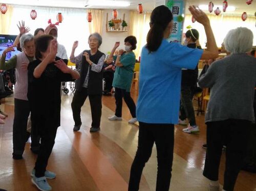 盆踊りは職員が柏音頭を、そしてご入居者様と一緒に九州炭坑節を踊りました!