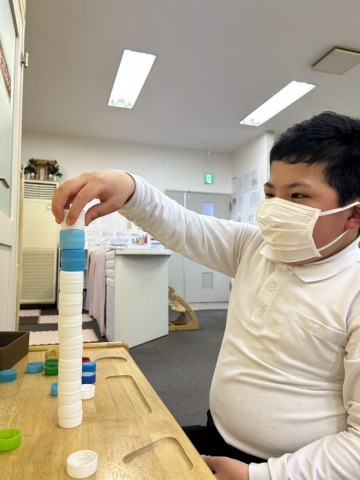 キャップの色を揃えて綺麗に積んだり、自分なりの積み方を工夫したりと、遊びの中にもそれぞれの個性が光っていました。