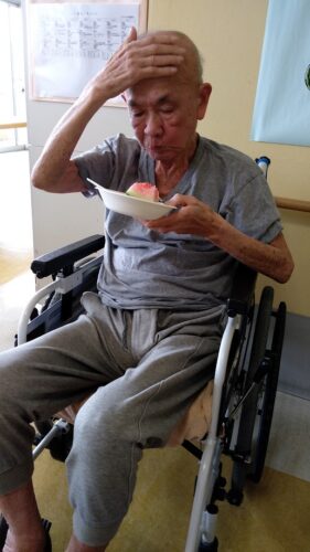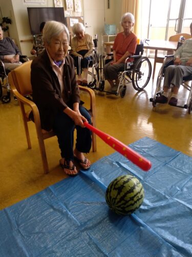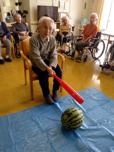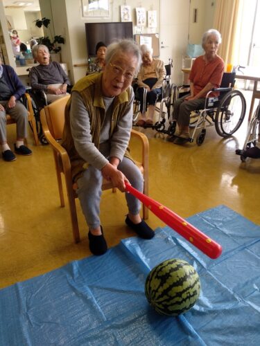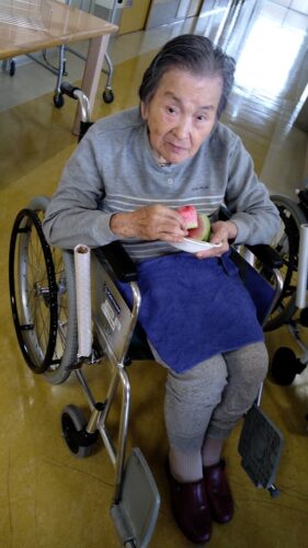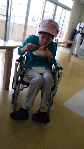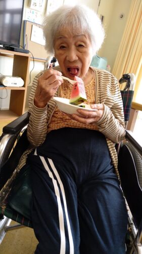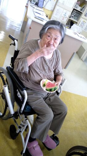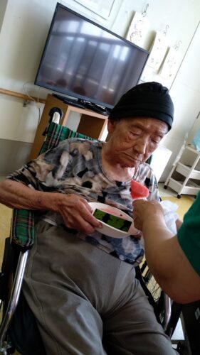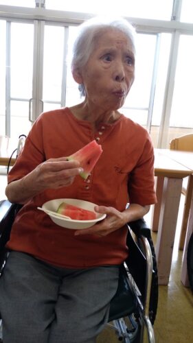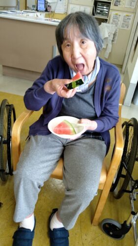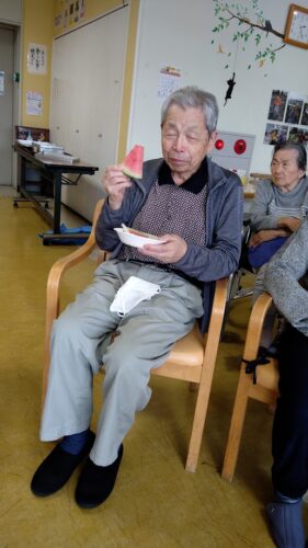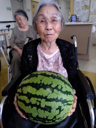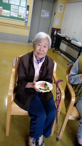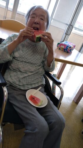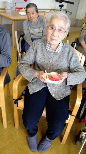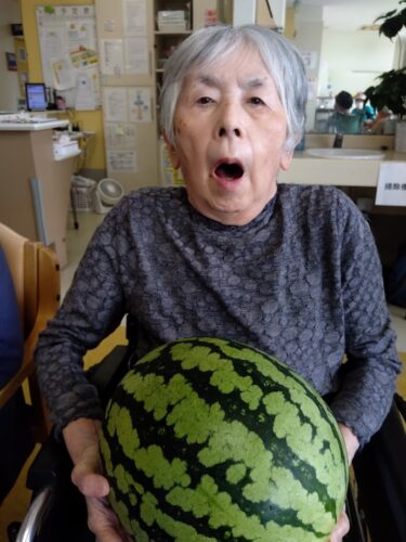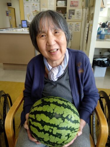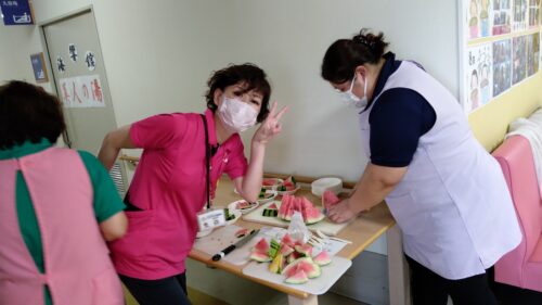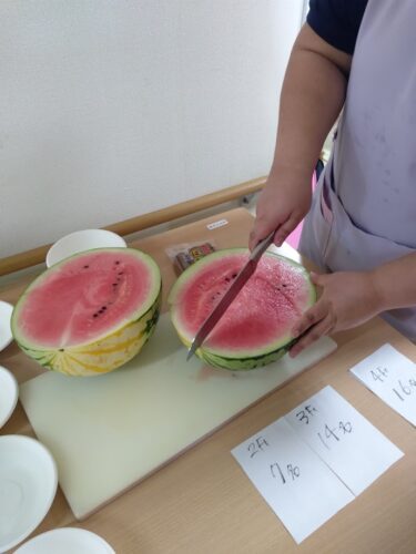 森副施設長、山本主任、職員総出でスイカを切り分け、入居者様にお配りしました。