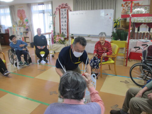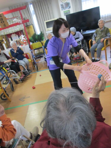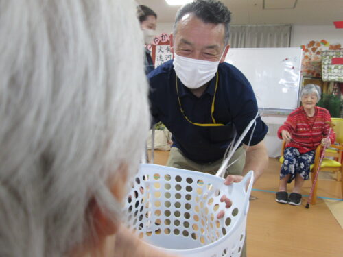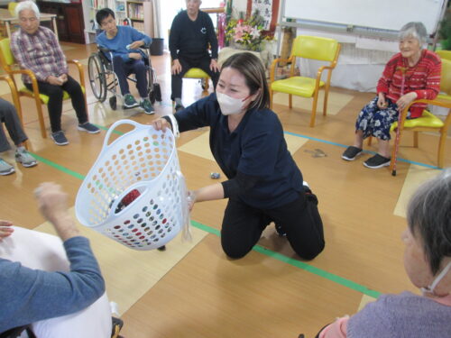 職員が持つカゴをめがけてお手玉を入れて頂きました!