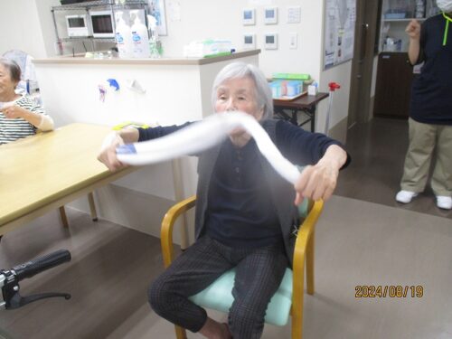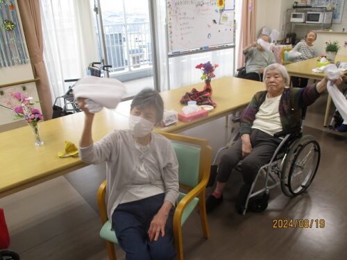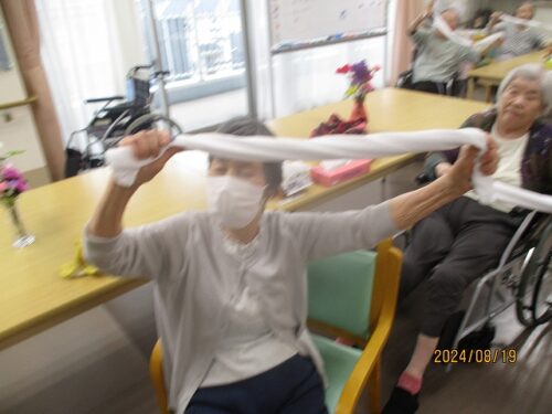われは海の子をタオルを使い行いました。無理しないよう頑張て下さいと、ご説明すると「まだまだ若いので頑張れます。」と笑顔で話されました。
