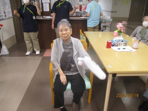 お断りされる方が多く女性のご入居者様が中心の体操になりましたが、一所懸命に取り組まれておりました。