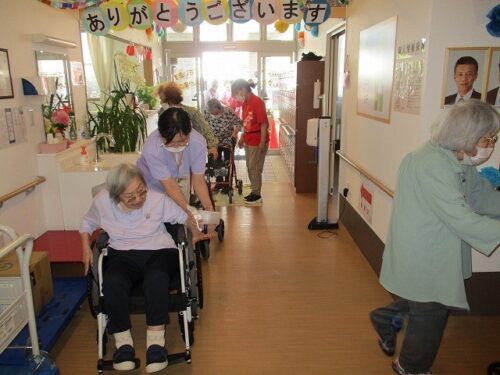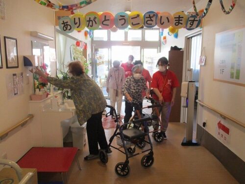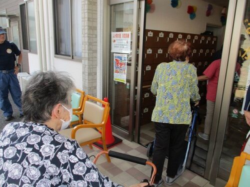 避難訓練が終わりご入居者様がお部屋に帰られる所です!