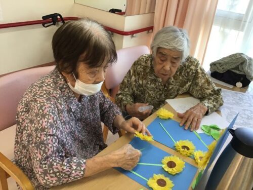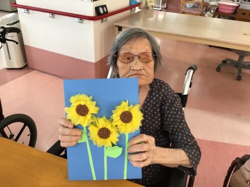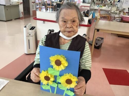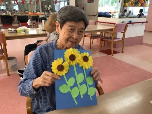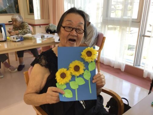 先週、デイサービスのレクの時間に「ひまわり」の作品を作りました。