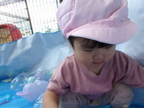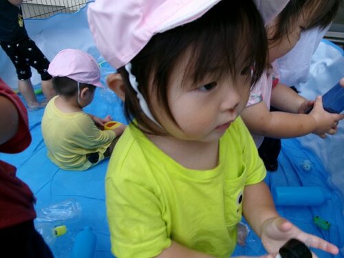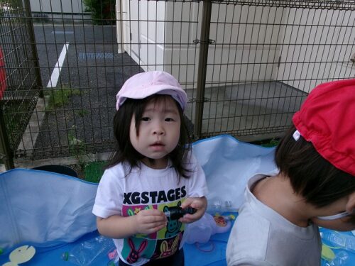 毎日西側の中庭に大きいプールを出して、だいたい10分~20分程入って遊びました