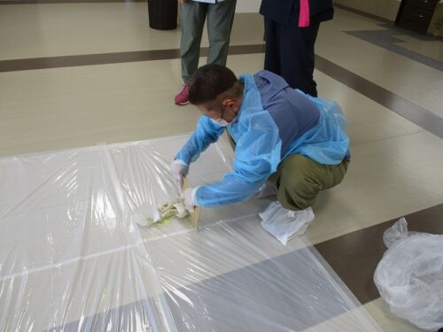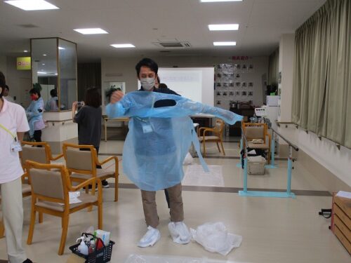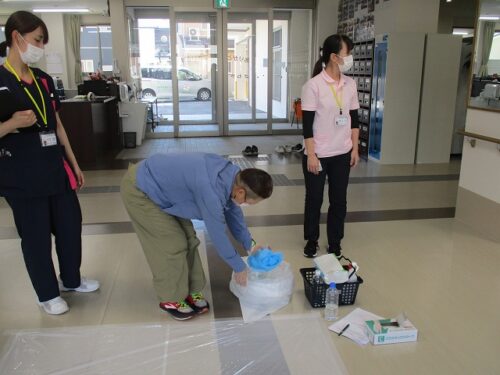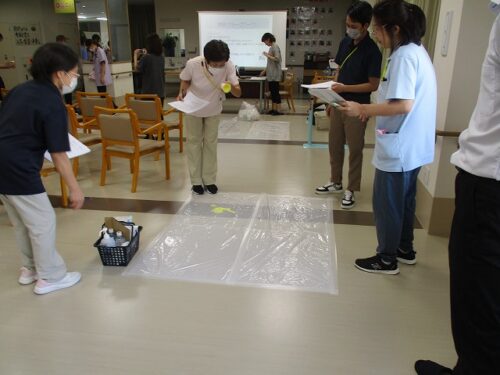 先日、あかし保健所の出前講座があり、吐物処理の勉強会を行いました。