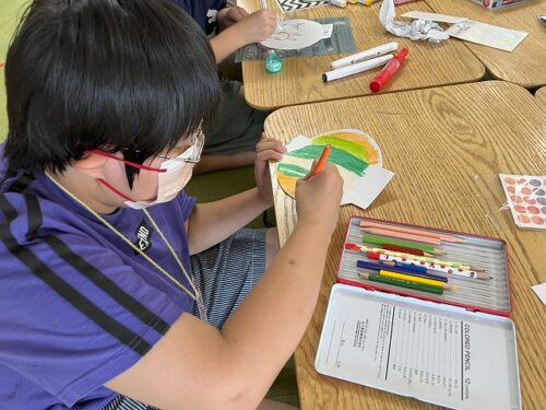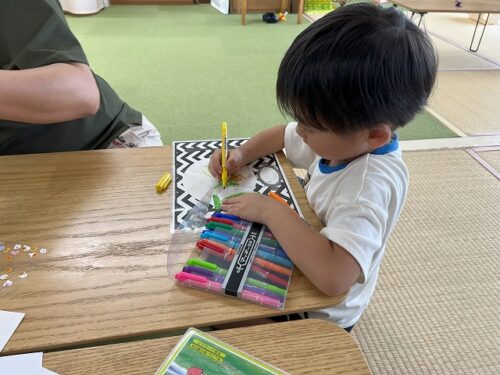 提灯の形に切った画用紙に飾り付けをしていきました❗
