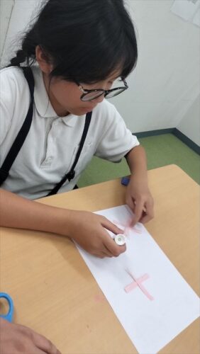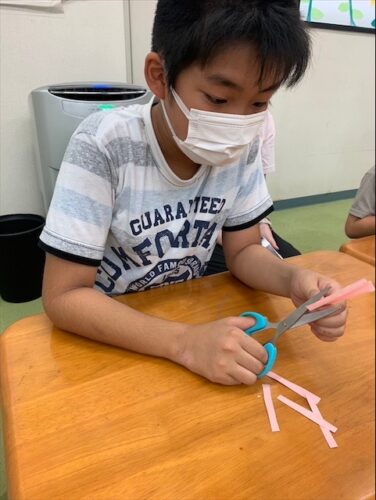最初に、コスモスになるピンクの折り紙を線に沿って切っていきます✂️