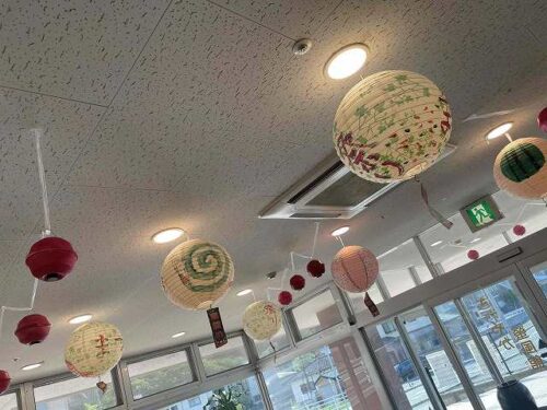 大きいお手製提灯もプカプカ舞っております👀✨ライトに照らされて、館内もお祭りモードになってまいりました🏮💡🏮