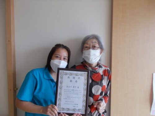 奥出様は88歳の米寿です。おめでとうございました。9月の下旬になっても連日記録的な猛暑が続いていますが、皆様が健康で過ごされるよう、職員一同努めさせて頂きます。