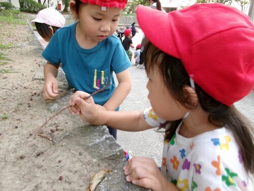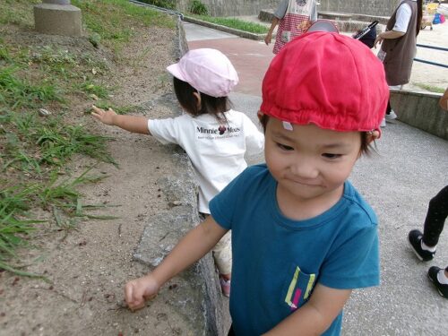 「どんぐりかな?木の実かな?虫だったらいいな…」