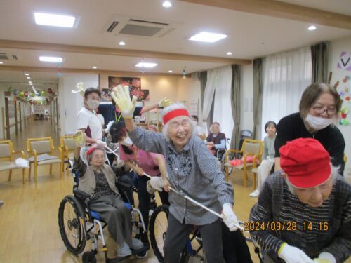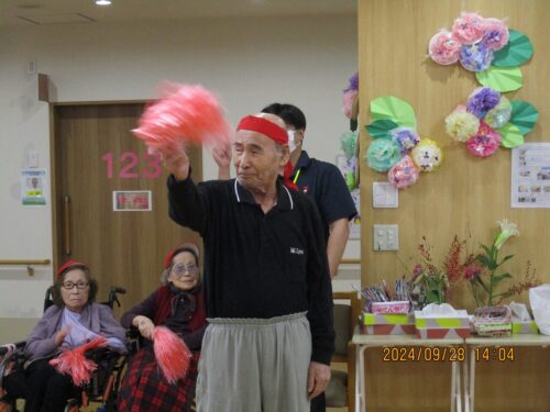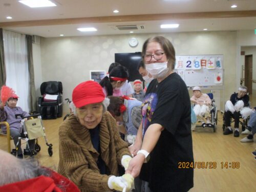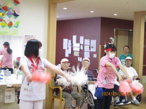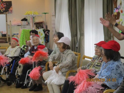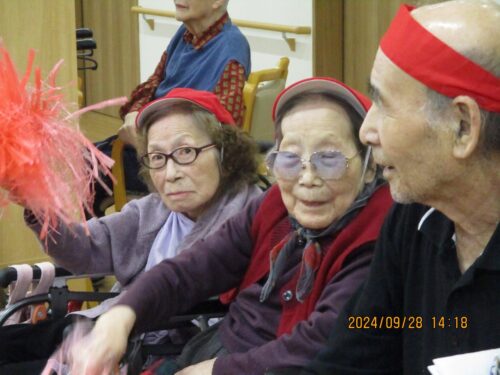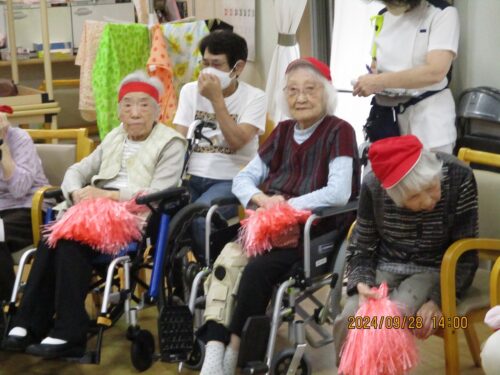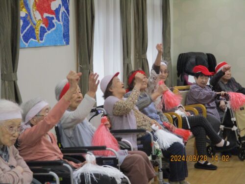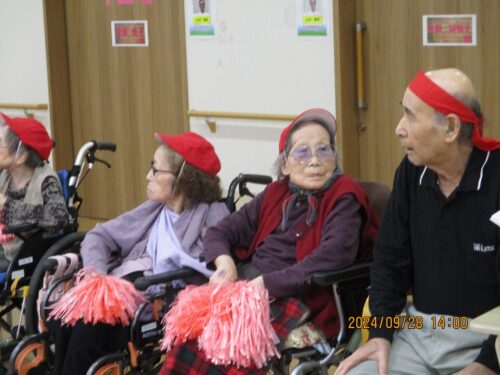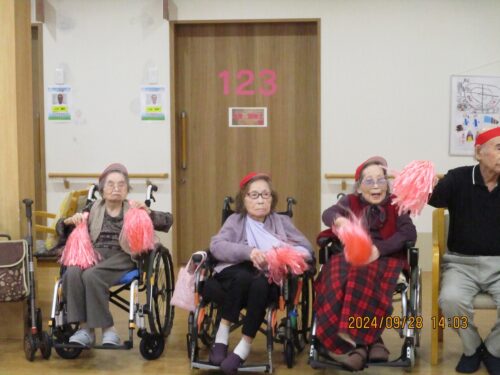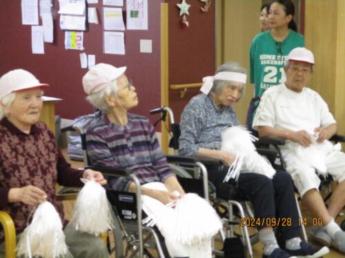 紅白帽を被って、ポンポン持って応援合戦の練習です