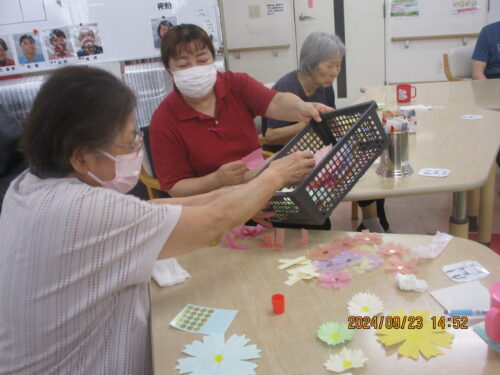 さて、今回はご利用者様と一緒に色んな紙で花を作りました(●´ω`●)