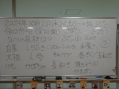 さわやか室蘭弐番館 2階 2日活力朝礼♪ 2024-10-03 2024-10-02 皆様こんにちは♪ 昨日の様子をお届けします 日付の確認後はラジオ体操です 頭の体操は少しづつ秋が深まる北海道 お鍋でお好きな具材お答え頂きました 笑顔溢れる一日になります様に☆
