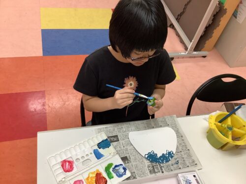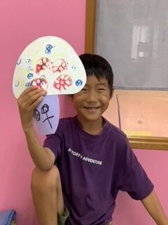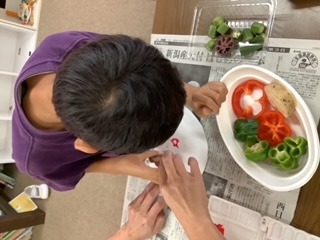 蓮根やパプリカを使って、野菜スタンプを押していきましょう👦