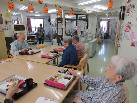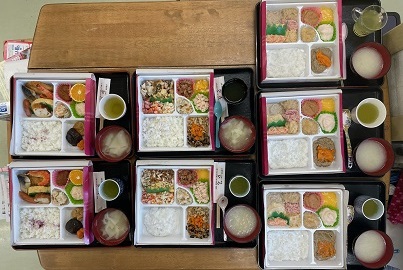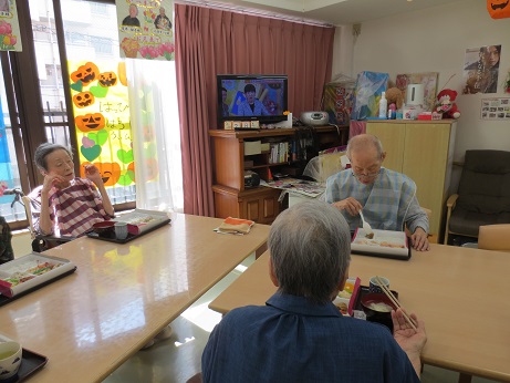 グループホームかがやき ♪ 町内敬老会よりお弁当 ♪ 2024-10-03 2024-10-03 町内の敬老会に参加されなかった入居者様の食事風景です🍴 常食、キザミ食、ミキサー食にして、お出ししました🍴 皆様お弁当を喜んで下さり、おいしく頂きました🍴 ☆ う す い ☆彡_(._.)_