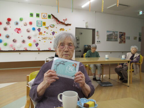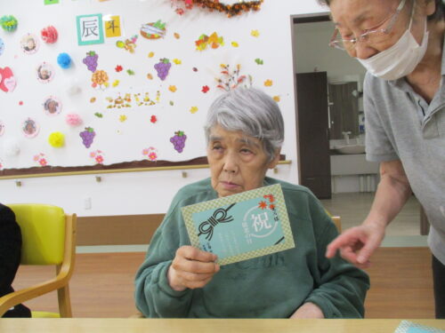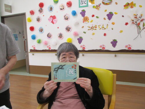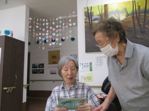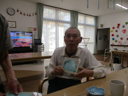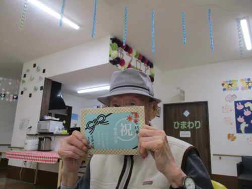 敬老の日にお祝いをさせて頂きました。カードのプレゼントに笑顔満開でした