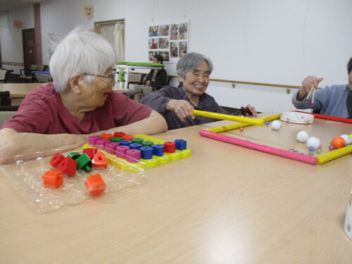 小さい玉や大きい玉を棒で寄せたりスプーンですくったりお箸でつかんだりと