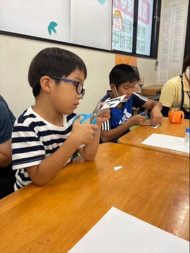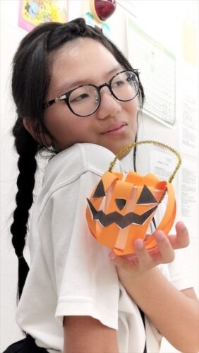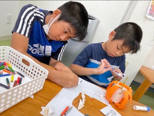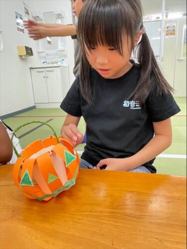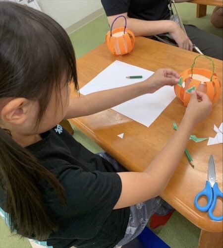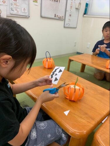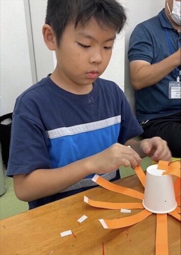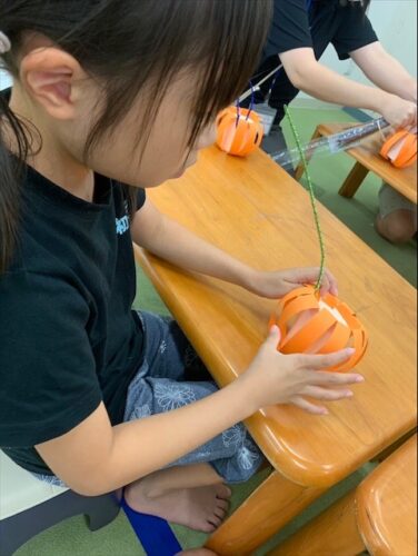 紙コップに、カボチャとなる画用紙を貼っていきます。
